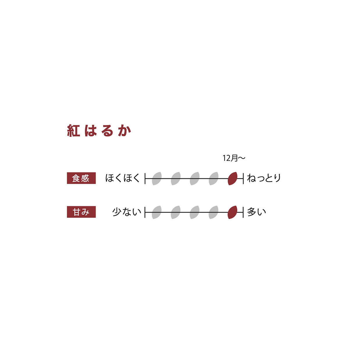 九州生まれの高糖度品種「紅はるか」。しっかりと熟成させ、じっくりと焼くと、蜜が滴り、糖度が40度以上にもなることも。衝撃的な甘さと、ねっとり食感は、唯一無二の天然スイーツ。焼いて冷凍保存すれば、夏でも冷たい焼き芋をお楽しみいただけます。